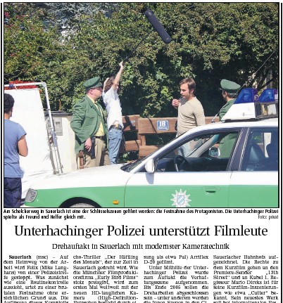 "Der Häftling des Monats" turns out to be the first short film in the world which was shot on the High-Def prototype camera by ARRI mentioned above. The production is aimed at publication on the German pay TV "13th Street" (broadcasting date still due to be announced) as well as it's aimed to be sold to the German TV-Channels "ARTE" and "3-SAT"; for the whole of the studio shoot the crew was allowed to re-use the originally built set of the previous production by "Bavaria-Films" called "The Perfume" (starring Dustin Hoffmann). As "The Prisoner of the Month" the film was also screened at the Portobello Film Festival 2007 and there is still a website for the film online featuring a 30 sec. "Teaser"/"Trailer" (to be found in the "links" section). |