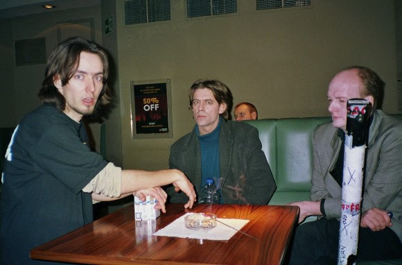 | Briefing for the actors at the "Wax Bar" before rehearsal (fr.l.): director Filip Firlej, Tim Eagle, Nick Evans | |||||||