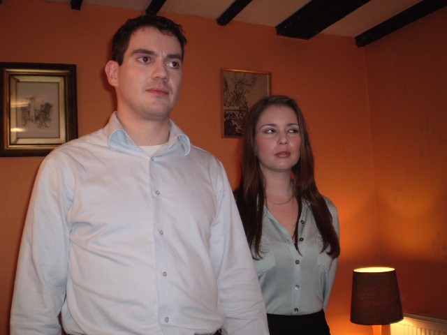 | "The unsuspecting couple": actor Rob Wainwright (l.) and actress Sarah McKendrick (r.) | "The three fearsome domestic intruders"(from l.): actors Tim Wilderspin, Jack Corcoran and John Terrance | ||||