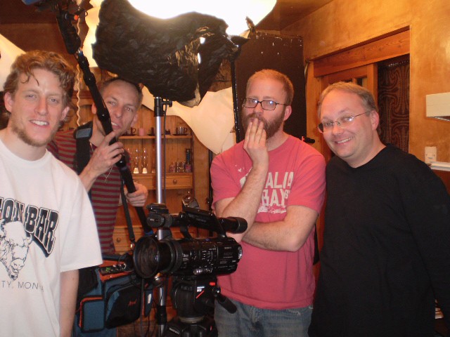 | publicity / behind the scenes still "Rough him up" - most of the crew (from l.): camera assistant Kevin Chapman, sound recordist Claus Zingler, D.O.P. Benn Peacock and director Nicholas Hughes | ||||