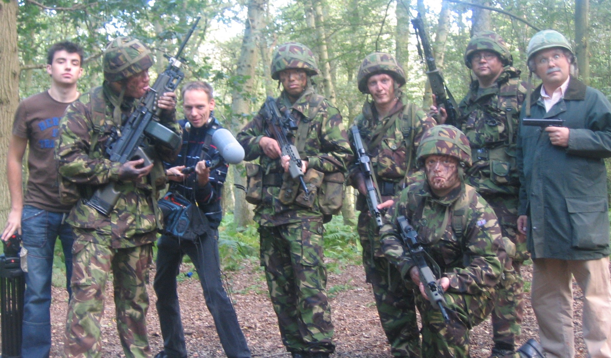 | publicity still "War Stalker 3" - most of the cast with camera assistant Andrew Moffett (l.) sound recordist Claus Zingler (3rd fr. l.) and producer Nicholas Hughes (r.) | ||||
